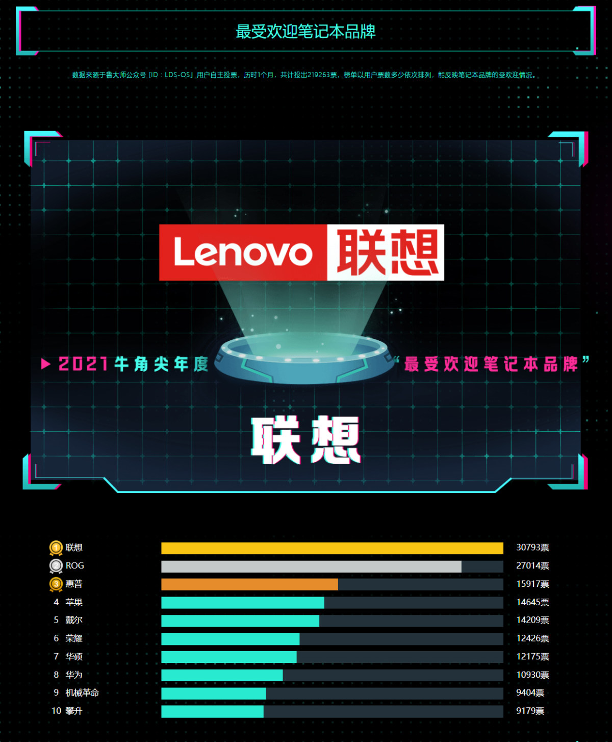 数据来源于鲁大师公众号 [ID : LDS-OS」用户自主投票,历时1个月,共计投出219263票,榜单以用户票数多少依次排列,能反映笔记本品牌的受欢迎情况。