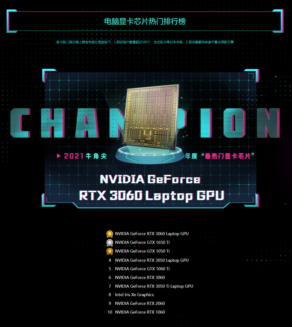2021年笔记本市场繁荣,各大品牌纷纷亮出杀手锏笔记本对战厮杀,这其中最受用的招数就是高性能显卡,获得鲁大师2021牛角尖奖“最热门显卡芯片”的是NVIDIA GeForce RTX 3060 Laptop,为电竞笔记本注入无限可能性。