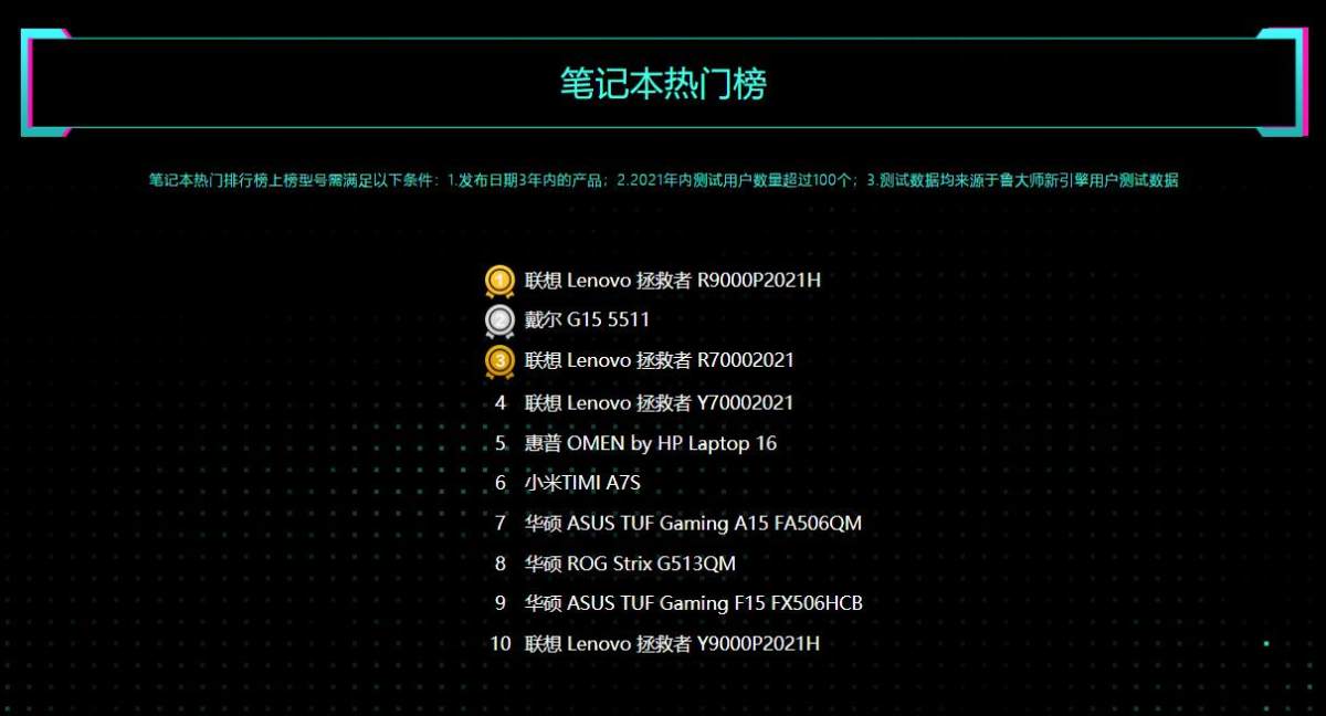 性能榜是高端游戏玩家的主场,热门榜则是普通玩家的天下。一度被抢断货的联想拯救者 R9000P2021H拿下冠军,这款笔记本采用Ryzen 7 5800H+RTX 3060 Laptop的配置,定价8000左右,能满足玩家的需求和预算。