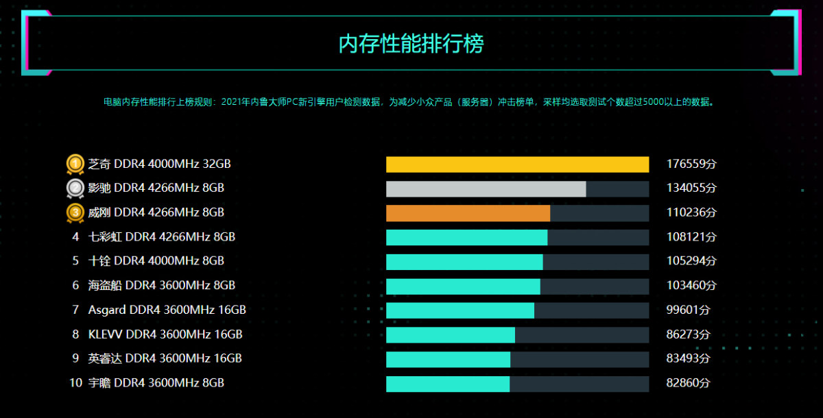 2021年度性能最强的内存来自芝奇DDR4 4000MHz 32GB,拥有超大容量的同时还具备4000MHz的高频率,超频玩法花样百出,性能一骑绝尘,均分达到了17万,远超第二名影驰 DDR4 4266MHz 8GB。