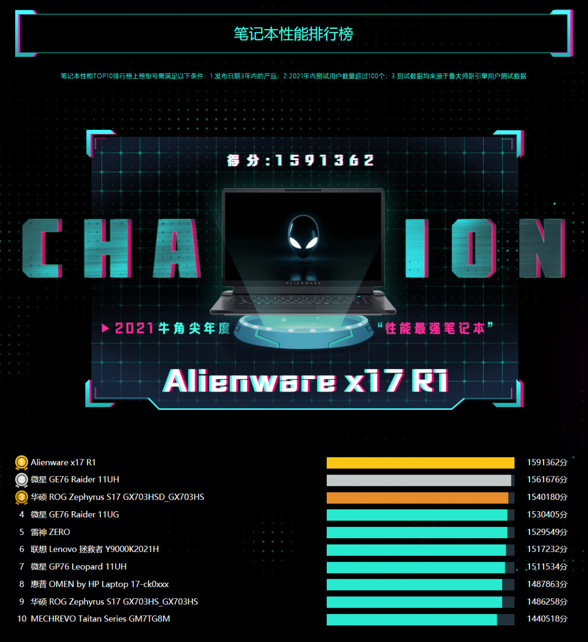 获得鲁大师2021牛角尖奖“性能最强笔记本”的是来自戴尔外星人的顶级旗舰Alienware x17 R1,强大的实力+行业顶级的配置和品质,让它以超过159万均分的成绩成为2021年笔记本性能榜NO.1。