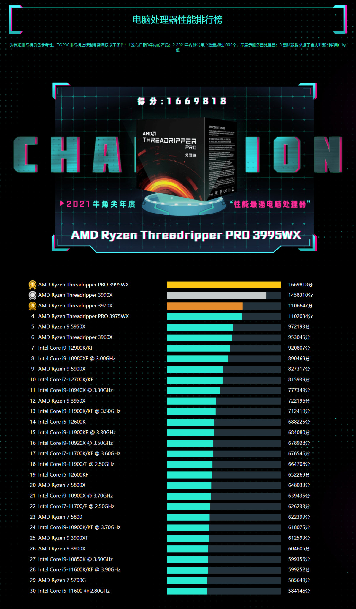 自线程撕裂者系列诞生以来,放眼当今CPU江湖,能击败他的只有它自己。获得鲁大师2021牛角尖奖“性能最强电脑处理器”的是AMD Threadripper PRO 3995WX。7nm工艺、Zen 2微架构、64核心128线程、它以新引擎166.98万分的超神成绩,成功登顶2021年CPU性能排行榜冠军。
