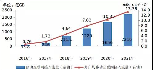 2021年,全年移动互联网接入流量达2216亿GB,比上年增长33.9%,移动互联网月户均接入流量(DOU)达到13.36GB/户·月,其中12月当月DOU达14.72GB/户,创历史新高。