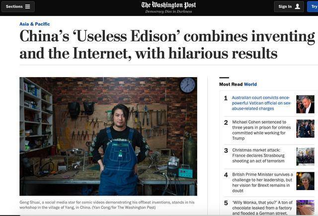 在国外,手工耿被美国《华盛顿邮报》、英国《每日邮报》报道,甚至他的视频内容多次出现在了日本综艺中,就连一向推崇“工匠精神”的日本人也开始纷纷研究他的“无用发明”。