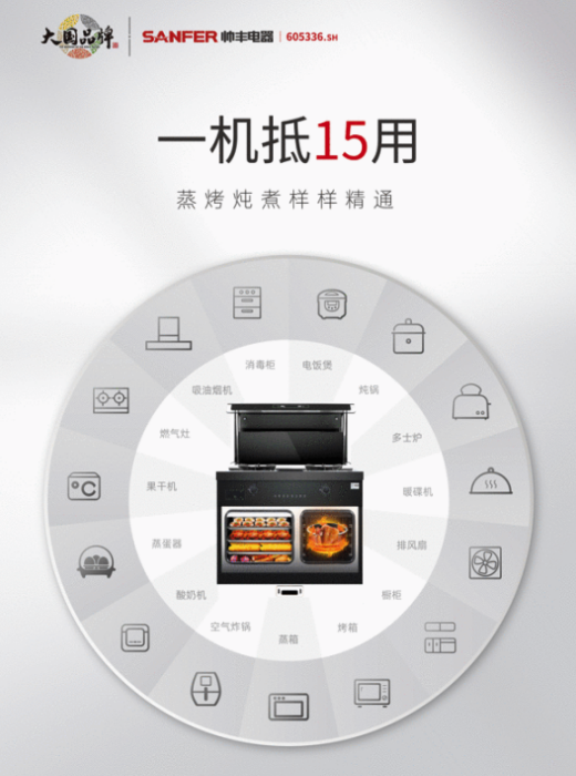 而今,帅丰推出了“集成厨房百味,帅丰一部到位”的全新产品Slogan,已经能够完美解决这一痛点。帅丰双子星系列蒸烤一体集成灶,一台机器就集成了燃气灶、油烟机、果干机、电饭煲、炖锅、多士炉、暖碟机、排风扇、烤箱、蒸箱、蒸蛋器、橱柜、消毒柜等15项功能,几乎将整个厨房的功能都融入了1㎡的空间中,让厨房瞬间变宽敞,大幅度提升了生活的幸福感。
