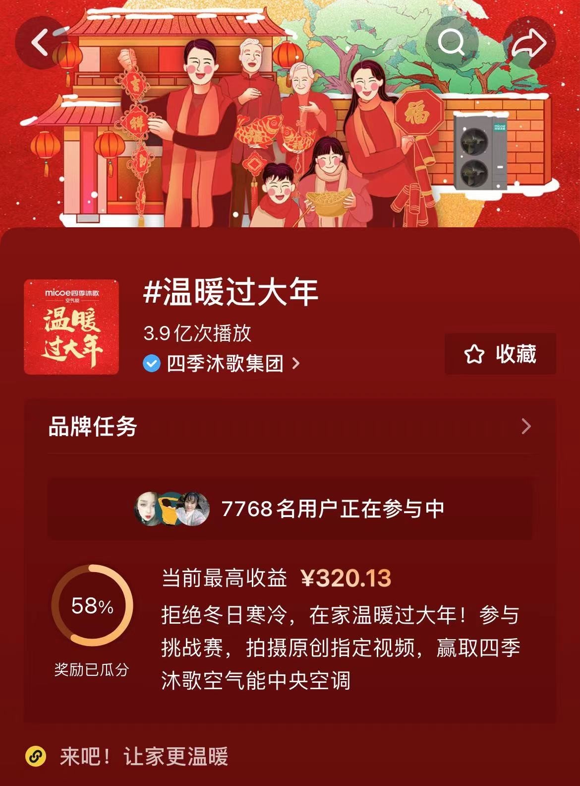 暖身亦暖心,将“暖”字贯穿至活动的每一处细节。可以说,#温暖过大年#抖音挑战赛以喜闻乐见且简单易行的方式,全心助力消费者打造令人向往的、温暖的生活场景,体现了四季沐歌对消费者需求的深度洞察,引导消费者建立更符合现代人生活节奏与精神追求的生活方式。截至到2月3日,即大年初三,#温暖过大年#抖音区域挑战赛已播放超过3.9亿次,成为这个新年里的又一个全新“年俗”。