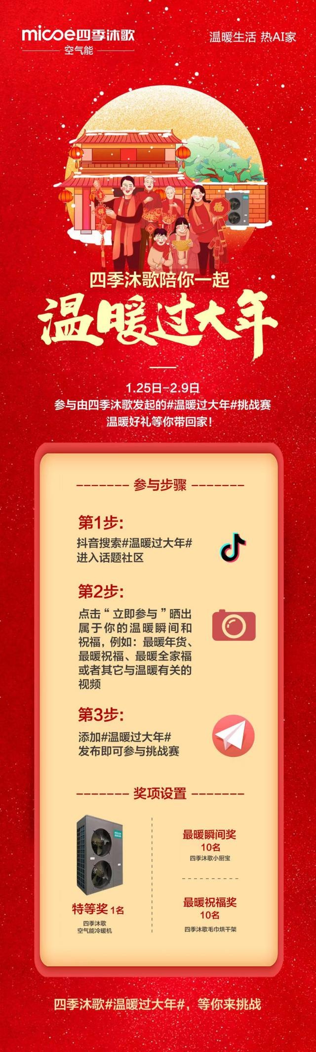 值得一提的是,#温暖过大年#抖音挑战赛期间,凡是参与挑战发布视频并@四季沐歌集团的小伙伴,都有机会赢取四季沐歌特别奉上的四季沐歌空气能冷暖机、四季沐歌毛巾烘干架、四季沐歌小厨宝等超级暖心大礼。