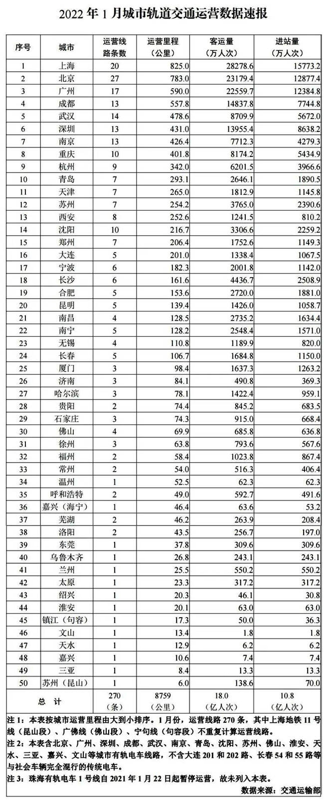 北京2月7日电 (记者王连香)据交通运输部消息,2022年1月,全国31个省(自治区、直辖市)和新疆生产建设兵团共有51个城市开通运营城市轨道交通线路270条,运营里程8759公里,实际开行列车285万列次,完成客运量18亿人次,进站量10.8亿人次。