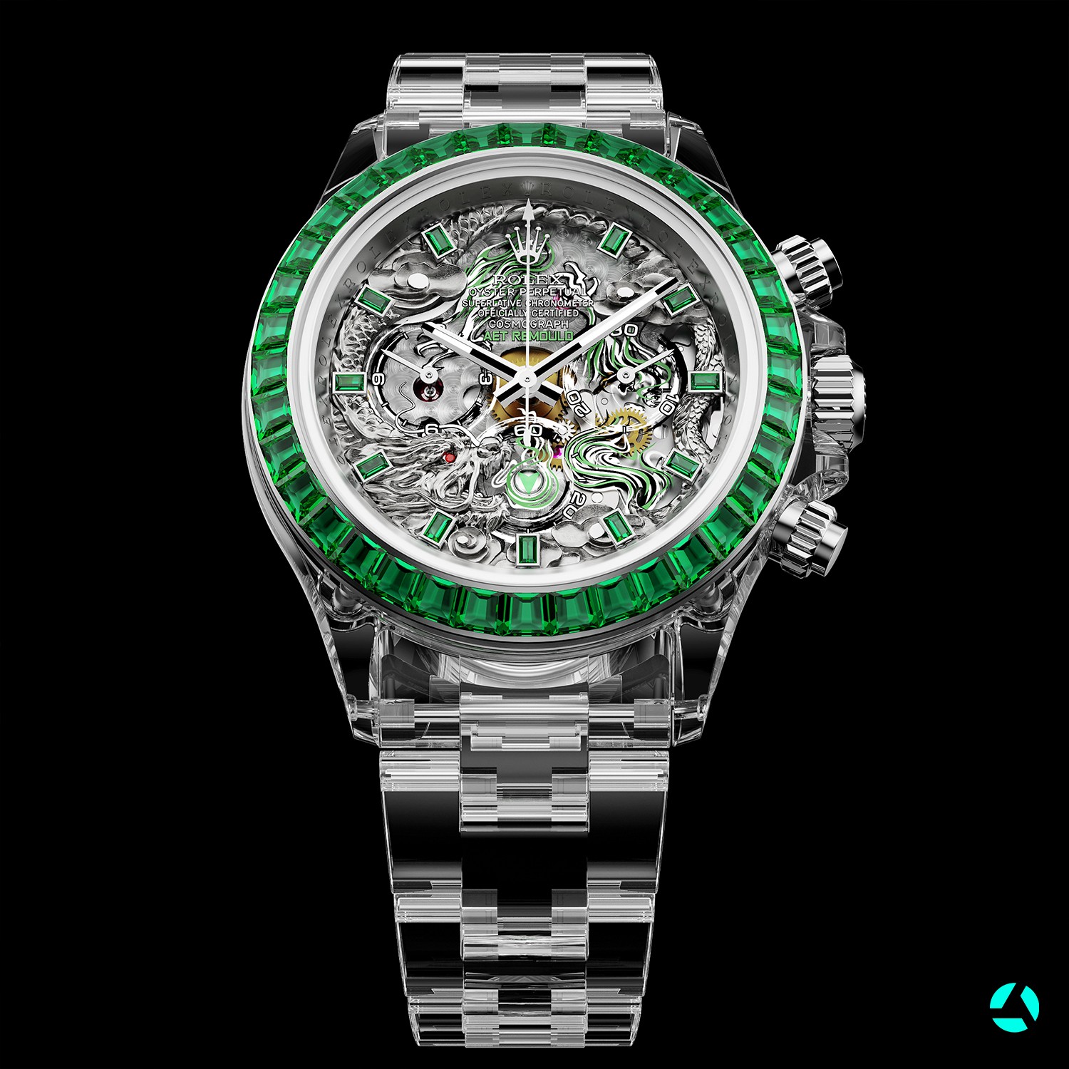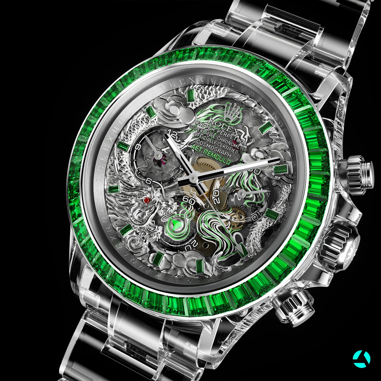 AET REMOULD对于珠宝的应用不止于此,他们在“Loong”的表圈镶满了绿宝石,每一颗宝石紧密排列,一瞬间便可以夺得眼球的关注。而想要将宝石整齐划一的镶嵌进表圈并非易事,这需要保证每一颗宝石都切割到准确的尺寸,以及需要制表师具备丰富的镶嵌经验,从这不难看出AET REMOULD对于这一领域已经驾轻就熟。