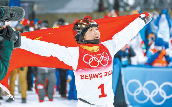 北京冬奥会自由式滑雪女子空中技巧决赛最终轮一跳定胜负,中国队徐梦桃夺得金牌。 本报记者 潘之望摄
