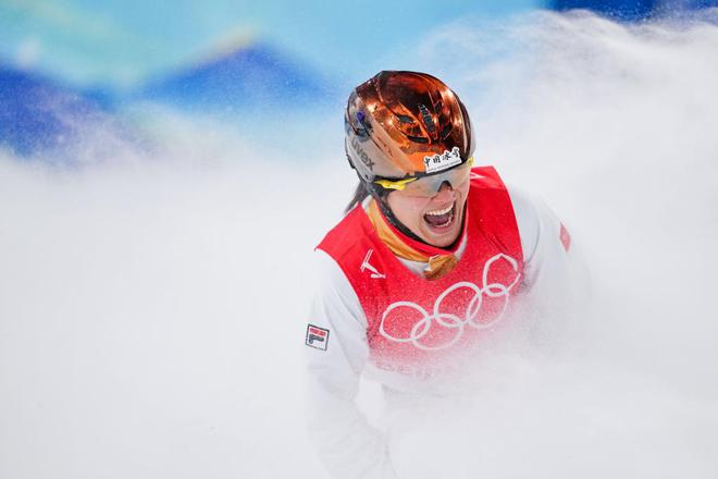 披上国旗,朝着跳台的方向,她跪倒在雪地里。起身,她已情不能自已,一声声呐喊,响彻云顶滑雪公园的上空。