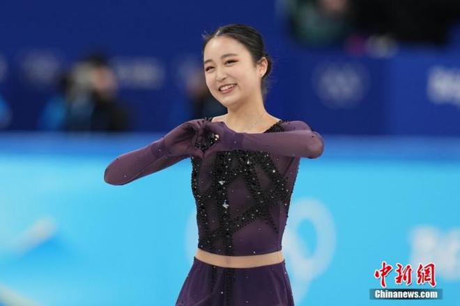 2月15日,北京2022年冬奥会花样滑冰女子单人滑短节目比赛在首都体育馆举行。图为中国队选手朱易比心。 中新社记者 崔楠 摄