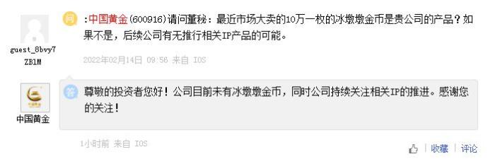 2月17日电 17日,针对有投资者询问最近市场大卖的10万一枚的冰墩墩金币是否为中国黄金公司的产品,中国黄金在互动平台回复称,公司目前未有冰墩墩金币,同时公司持续关注相关IP的推进。