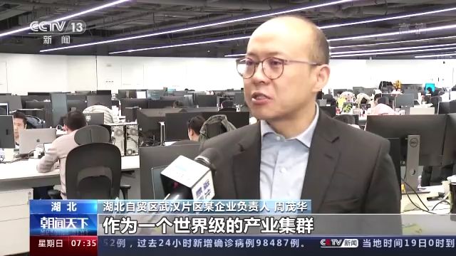 湖北自贸区武汉片区某企业负责人 周茂华:光、 芯、 屏、 端、 网,作为一个世界级的产业集群,集合了一大批优秀的行业领军企业,为我们整个的发展提供了良好的生态产业环境。