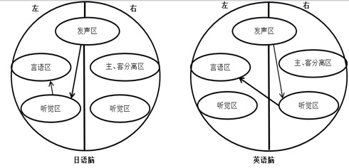 笔者本人也在一些别的以日语言说者为被试的语言神经学研究资料中发现了类似的报告。譬如,日本东京电机大学工学部月本洋教授通过对于说日语的被试者与说英语的被试者的大脑所做的核磁共振成像研究,指出:日语母语者之所以不倾向于使用主语(比如,日本人在自我介绍时一般不说“我是山田,”而仅仅说“山田是也”),乃是因为其与语言表述相关的大脑信息传播回路与英语言说者不同。具体而言,“日语脑”的信息加工回路是这样的:发声区被激活后,处于左半球的听觉区就倚靠对于元音因素的听取而被激活,并将刺激信号传导向与之毗邻的语言区。由于听觉区与语言区之间的距离很短,所以,听觉区所获得的资讯结构就非常容易被投射到语言结构上,而不会因为别的信息加工单位的介入而失真。这就造成了所谓的“认知结构与言语结构在日语脑中的同构化”。