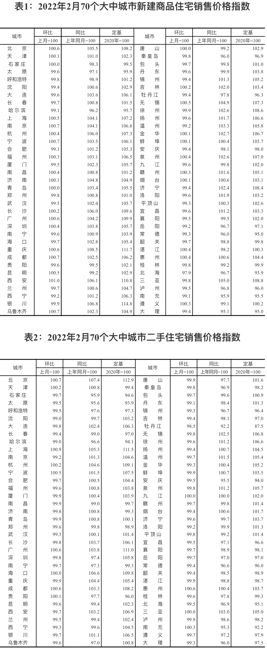 北京3月16日电 (记者杨曦)国家统计局今日发布数据显示,2022年2月份,70个大中城市中,一线城市新建商品住宅和二手住宅销售价格环比上涨,二三线城市环比持平或下降;一二线城市商品住宅销售价格同比涨幅回落或持平,三线城市同比下降。