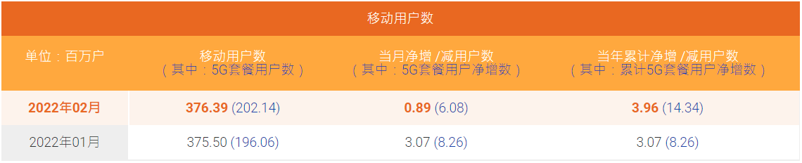 了解到,昨天中国移动也公布 2022 年 2 月客户数据公告,移动业务方面,客户总数累计到达 9.61 亿户,本月净增数为-62.9 万户,本年累计净增数 386.8 万户;5G 套餐用户数累计到达 4.25 亿户。