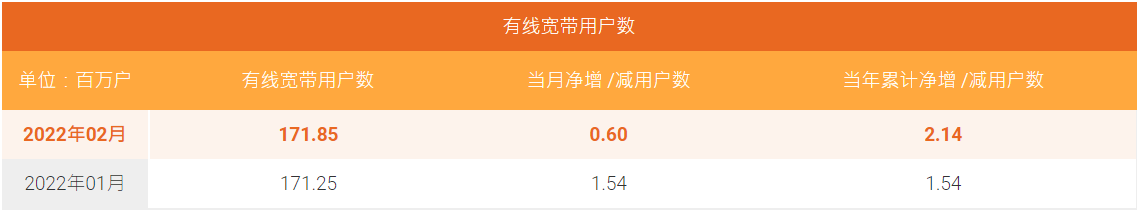 有线宽带业务方面,当月中国电信有线宽带用户数净增 60 万户,有线宽带累计用户数 1.7185 亿户。