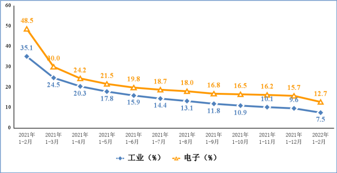 2022年1-2月份以来电子信息制造业和工业固定资产投资累计增速。图片来源:工业和信息化部运行监测协调局