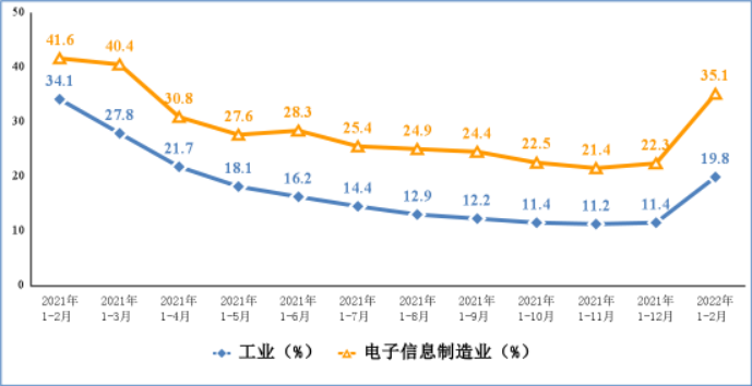 2022年1-2月份以来电子信息制造业和工业增加值累计增速。图片来源:工业和信息化部运行监测协调局