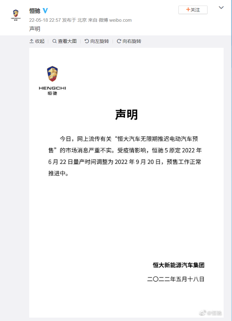 今日晚间,恒大汽车恒驰发布声明,“今日,网上流传有关‘恒大汽车无限期推迟电动汽车预售’的市场消息严重不实。受疫情影响,恒驰 5 原定 2022 年 6 月 22 日量产时间调整为 2022 年 9 月 20 日,预售工作正常推进中。”