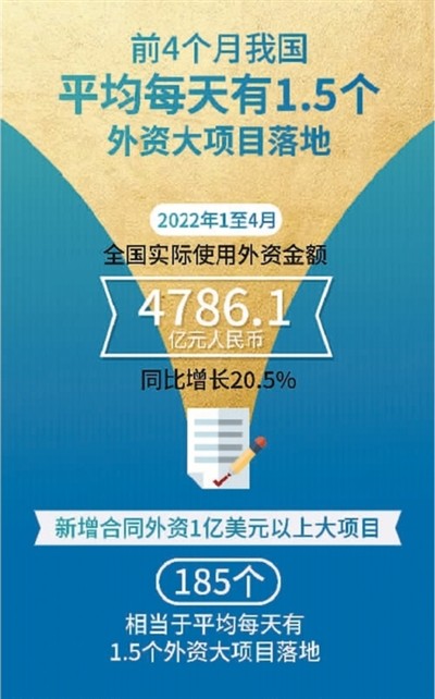 商务部数据显示,今年前4个月,全国新增合同外资1亿美元以上大项目185个,相当于平均每天有1.5个外资大项目落地。1至4月,全国实际使用外资金额4786.1亿元人民币,同比增长20.5%。这是在去年高基数基础上实现的两位数增长。