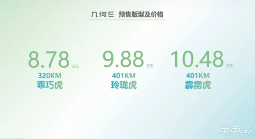 5 月 26 日,吉利旗下新能源汽车品牌几何的新车型几何 E,正式开启预售。车型方面,几何 E 将提供三个版本,其中乖巧虎车价为 8.78 万元、玲珑虎车价为 9.88 万元、霹雳虎 10.48 万元。