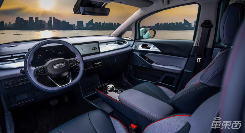 内饰方面,几何 E 也同外观一样采用了简洁的设计,中控台线条平直,采用了两个 10.25 英寸的高清一体双联屏设计,仪表盘与中控屏平行,驾驶时更方便驾驶者操作。