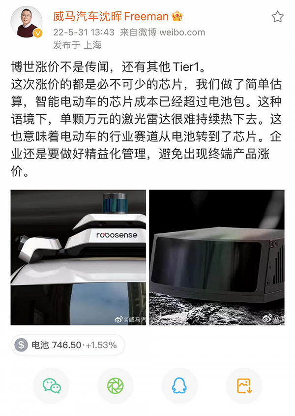 这种语境下,单颗万元的激光雷达很难持续热下去。这也意味着电动车的行业赛道从电池转到了芯片。企业还是要做好精益化管理,避免出现终端产品涨价。