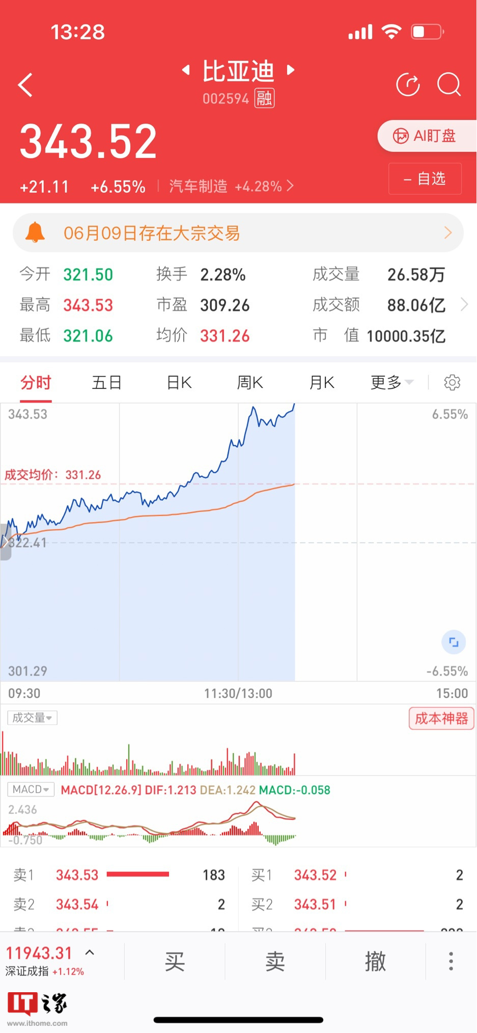 6 月 10 日消息,比亚迪股价破历史新高,盘中一度涨至 347.74 元 / 股,涨超 8%,单日成交破百亿,主力净流入超 10 亿元。