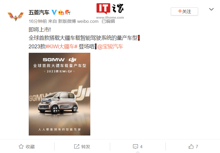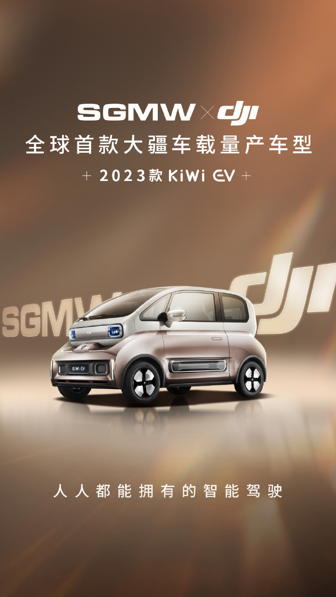 今天五菱汽车公布了这款全球首款搭载大疆车载系统的新能源量产车型的身份 ——2023 款宝骏 KiWi EV,官方称这款车即将上市,但并未公布具体时间。