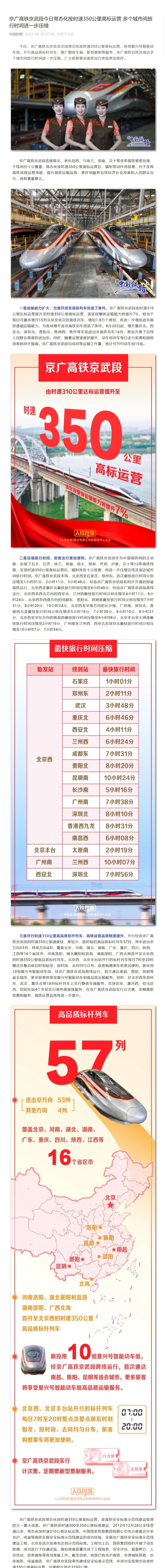 开行经由京广高铁京武段的时速 350 公里速度快、停站少、旅时短的高品质标杆列车 57 列,其中进出京方向 53 列、其他方向 4 列,覆盖北京、河南、湖北、湖南、广东、重庆、四川、陕西、江西等 16 个省区市,河南洛阳、湖北襄阳和宜昌、湖南邵阳、广西北海首开至北京西的时速 350 公里高品质标杆列车。