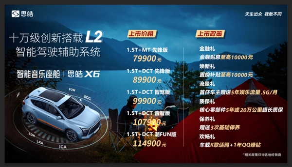 近日,思皓X6正式上市,新车共推出5款车型,售价区间为7.99-11.49万元。
