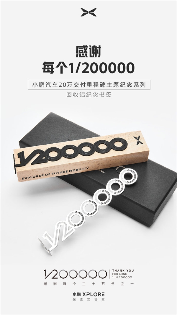 为了庆祝交付量突破20万台,小鹏汽车还推出20万交付里程碑主题纪念系列的回收铝纪念书签、纪念T恤以及佩戴式纪念徽章。