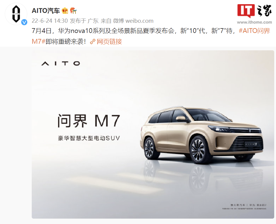 6 月 24 日消息,今日下午,AITO 汽车官方宣布,AITO 问界 M7 豪华智慧大型电动 SUV 将于 7 月 4 日在华为 nova10 系列及全场景新品夏季发布会上正式发布,宣传语为“新‘10’代,新‘7’待”。
