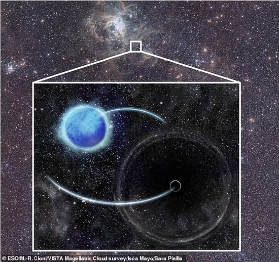图中背景是可见光和红外巡天望远镜 (VISTA) 拍摄的大麦哲伦星系,标记了 VFTS 243 所在位置,该图中恒星、黑洞和轨道大小均不成比例。