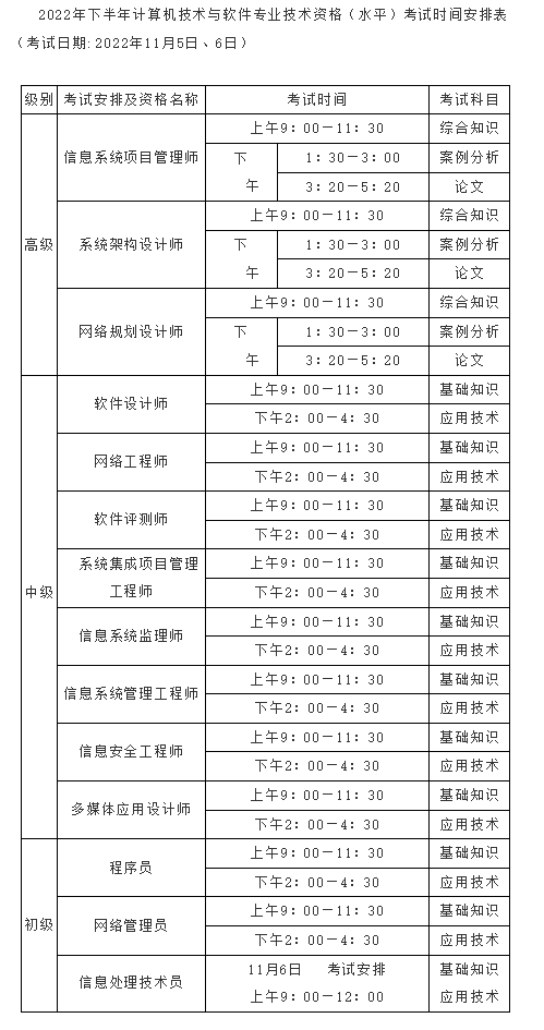 2022年下半年计算机软件考试设高级、中级、初级三个级别,分别为: