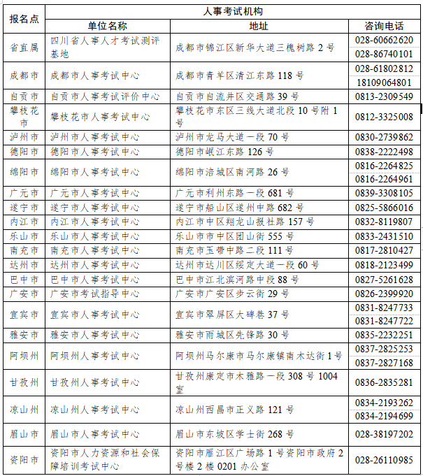 3.报名点选择:报名按属地划分管理,为减少报考人员跨地域流动造成疫情防控压力,报考人员原则上只能选择与现工作地、居住地一致的报名点报名。中央在蓉及省直属单位报考人员,须选择省直属报名点。