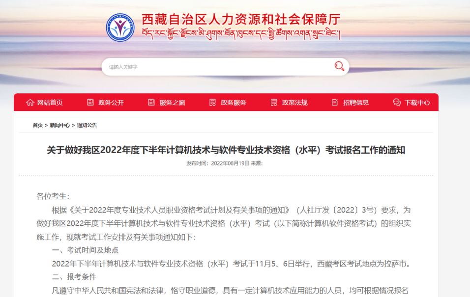 若想了解西藏自治区人力资源和社会保障厅发布的《关于做好我区2022年度下半年计算机技术与软件专业技术资格(水平)考试报名工作的通知》,可进入西藏自治区人力资源和社会保障厅网站查阅。