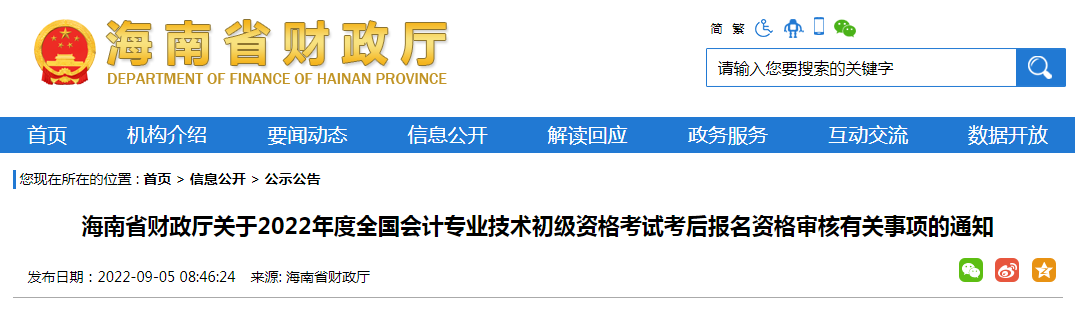 2022年9月5日消息,海南省财政厅发布了《海南省财政厅关于2022年度全国会计专业技术初级资格考试考后报名资格审核有关事项的通知》,通知中明确了2022海南初级会计考试考后报名资格审核时间为9月6日至23日,关于资格审核的相关事宜由本站编辑整理,详见下文。