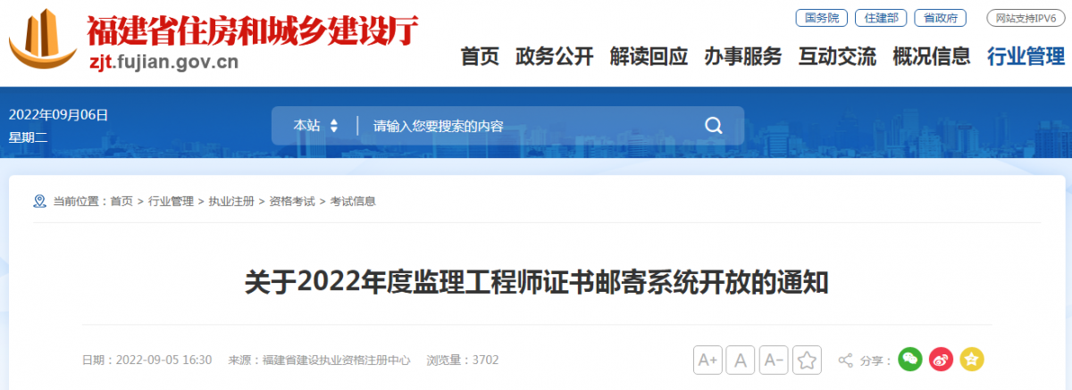 2022年9月5日消息,福建省住房和城乡建设厅发布了《关于2022年度监理工程师证书邮寄系统开放的通知》,从通知中了解到福建2022年度监理工程师证书邮寄系统开放时间为2022年9月6日至19日,公告原文如下。
