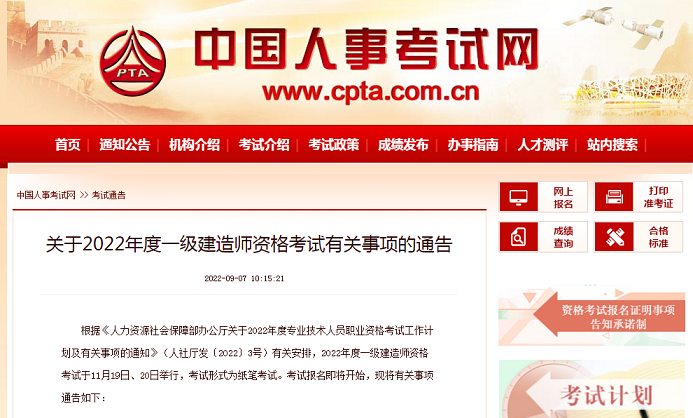 2022年9月7日,中国人事考试网发布了《关于2022年度一级建造师资格考试有关事项的通告》,宣布一建报名开始!公告内容包含考试科目、考试大纲、考试时间、报名条件等内容,详见下文。