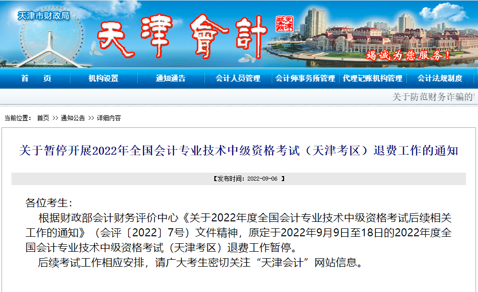 天津会计网发布的《关于暂停开展2022年全国会计专业技术中级资格考试(天津考区)退费工作的通知》