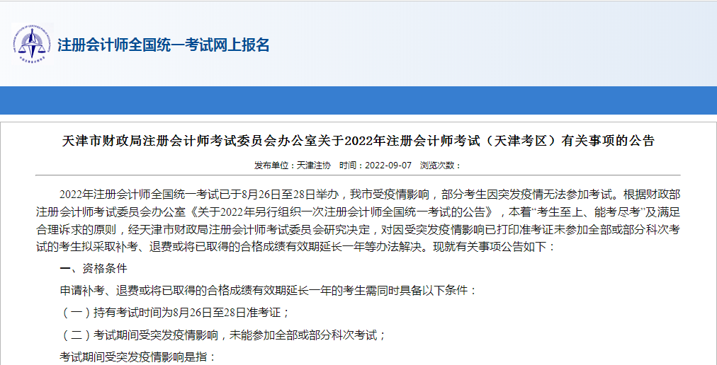 天津市注册会计师协会发布《2022年注册会计师考试(天津考区)有关事项的公告》