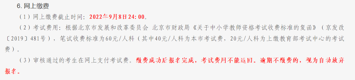 (2)考试费用:根据北京市发展和改革委员会 北京市财政局《关于中小学教师资格考试收费标准的复函》(京发改〔2019〕481号),笔试收费标准为60元/人科(其中40元/人科为本市考试费,20元/人科为上缴教育部考试中心的考试费)。