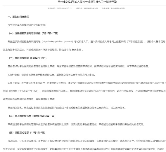 9月6日贵州省招生考试院官网发布《贵州省2022年成人高校考试招生报名工作即将开始》的公告,公告中明确了2022年成人高考报名时间为9月13日至17日,成人高考一年仅有一次考试机会,建议考生抓紧时间进行报名,避免错过报名时间,通知中与报名时间相关的原文如下: