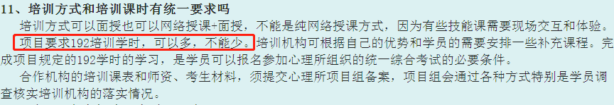 近日,本编辑从《常见问题解答(2022版) | 中科院心理所心理咨询师基础培训项目》获悉,报名心理咨询师考试的人员需参加由中国科学院心理研究所授权培训机构组织的系统培训后才能参加考试,官方为了更好的规范心理咨询师考生的学习能力,要求考生必须学满至少192学时才能申报心理咨询师考试。