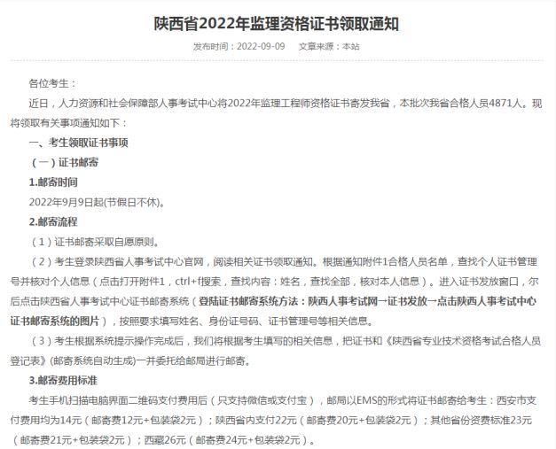 近日陕西人事考试网发布陕西省2022年监理资格证书领取通知,合格人员4871人。邮寄时间为2022年9月9日起(节假日不休),窗口领取时间为2022年9月20日—2022年10月22日,每周星期二、三、四领取证书(节假日除外),证书邮寄采取自愿原则。