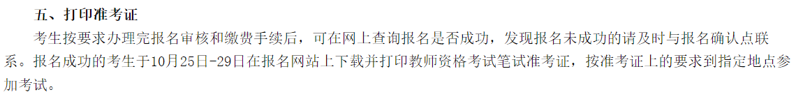 考生按要求办理完报名审核和缴费手续后,可在网上查询报名是否成功,发现报名未成功的请及时与报名确认点联系。报名成功的考生于10月25日-29日在报名网站上下载并打印教师资格考试笔试准考证,按准考证上的要求到指定地点参加考试。