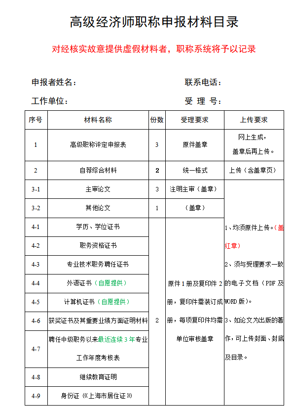 为加强学术规范,高评委办公室将对申报人所提交的论文抽样进行重合度检测,对经查实的学术不端行为“一票否决”。若申报人自己已进行过论文查重,请将查重报告随论文一起提交。除独著(译著)仅需上传封面、目录及封底外(PDF格式,打包成一个文件作为论文附件上传),提交论文的,需上传封面、目录、内容(PDF格式),以及所有论文的WORD版本,并确保与所提交的书面材料完全相同。凡未按要求上传论文材料的,高评委办公室不予受理。